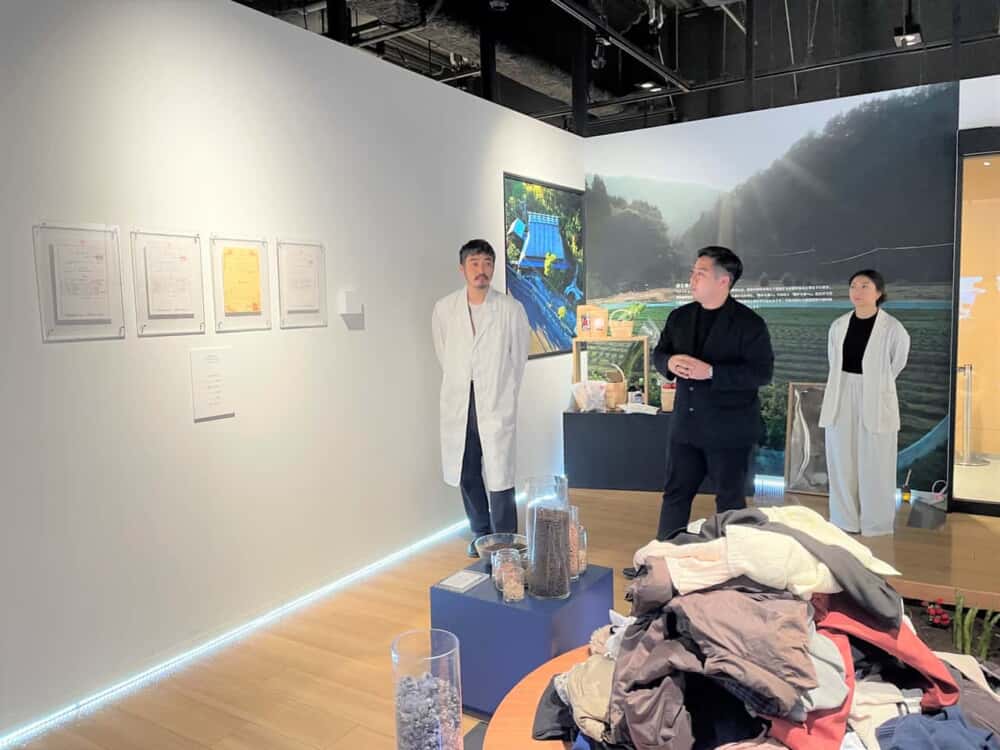 ポリエステルなどの化学繊維が環境や肌に与える影響や、天然繊維の安全性と心地良さを学ぶことができる展示エリア、不要になった衣類を実際に回収してもらえる衣類回収カウンター、肥料へ加工する工程を体験することができるワークショップスペースなどがあり、衣類がどのように循環するのかがわかるようになっています。