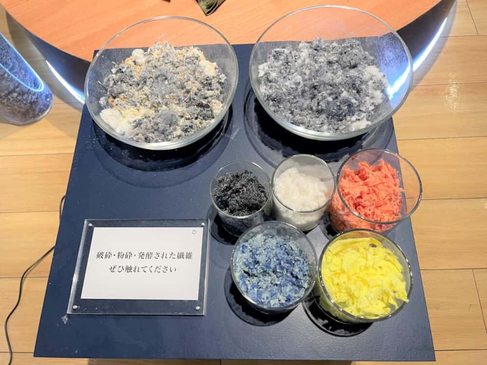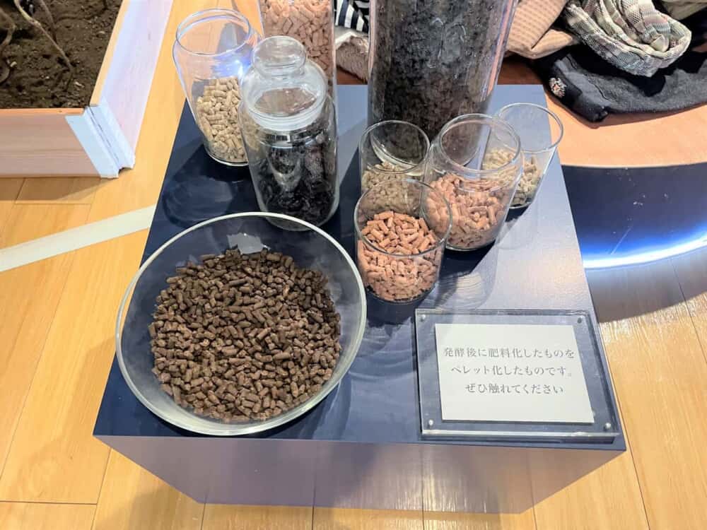 まず案内されたのは、廃棄衣類から作られた肥料が展示されているスペース。破砕・粉砕・発酵された繊維や、1~2㎝ほどの円柱状のペレットにされた肥料を見たり、触ったりすることができました。