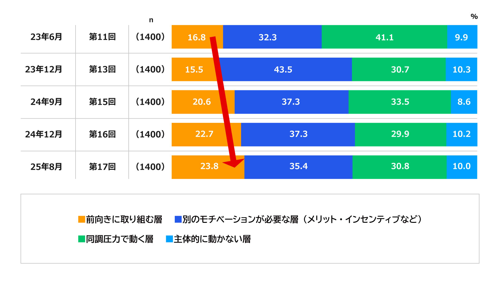 さらに、気候変動対策に「前向きに取り組む層」は23.8%と、2年前の調査(2023年6月)から7.0ポイントも上昇しています。環境問題への関心が、社会全体へと着実に広がり、自分も行動したいと考える人が増えていることがうかがえます。